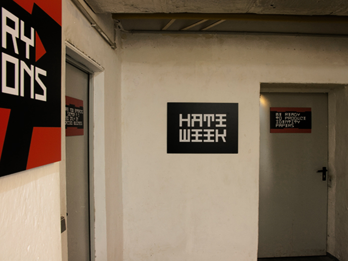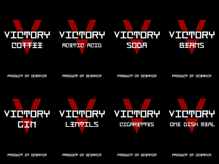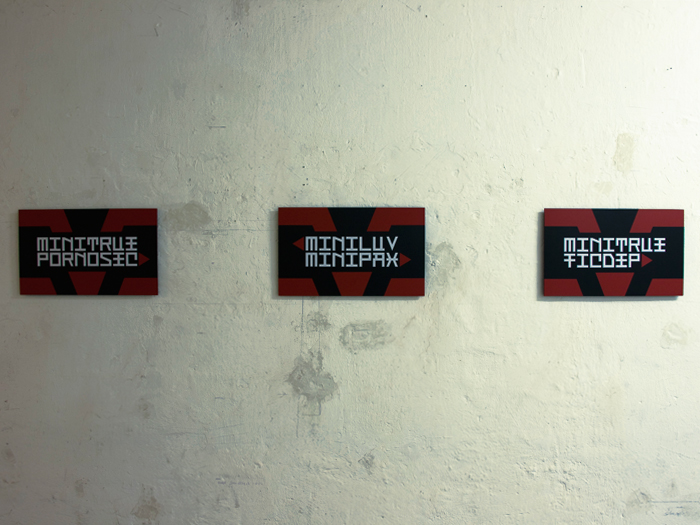 Illustrationen von Schlüsselszenen aus »1984«, sowie Plakate, welche zum Corporate Design von Ingsoc gehören und auf Wänden in ganz Ozeanien zu finden sind.