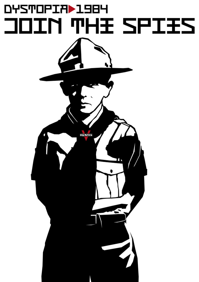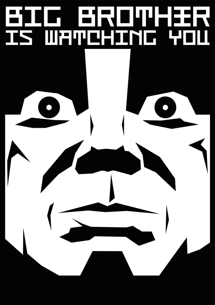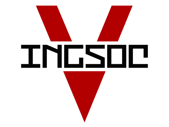Corporate Design der Partei Ingsoc aus George Orwells Roman 1984. Ingsoc ist die Einheitspartei Ozeaniens, an deren Spitze Big Brother, eine fiktive Person, steht. Das Big-Brother-Regime steht für totale Kontrolle und Überwachung der Bevölkerung.
